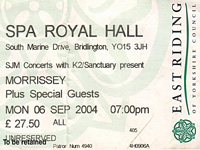 9月6日 Bridlington, England - Spa Royal Hall Spa Royal Hallは屋根の丸い建物でした。海沿いにある会場で何時間も待つのはやや寒かったですが、あれよあれよという間に会場、そしたら当然ダッシュ、警備員さんが居るところではニコやかに強歩してやり過ごす。そしてまたまた最前列ゲットです。 いつものようにジョブライアスを何周も聴き、そしてモリッシーコールが始まり、エルヴィス・オマージュ電飾(勝手に命名)が灯り、モリッシー登場。 この瞬間、くぁーーーーーーーっと熱くなります、何度経験してもこれは緊張します。しかも病み付きになりそうだ。 "I LIKE YOU"だったと思います。ファンが大声で歌い、モリッシーはなんだかもじもじして嬉しそうにマイクをスタンドに置きました。 個人的には、ファンが歌ってもモリッシーに歌って欲しかったけど、なんだかファンの声に満足したのか、その後この曲が終わるまでモリッシーは「THANK YOU」連発で歌わなかった。少し照れていたと思います。 中盤、気が付くとHがステージにあがって、そしてモリッシーに跪いてなにやらポーズを取ってました、そして警備員につれていかれてしまいました。会場大ウケ、モリッシーも笑ってました。 あとからHにどうやって登ったのか聞くと、ステージサイドの警備が手薄だったので登れたそうな。すげー……。その後、二匹目のどじょうのように青年が登ってゆきましたが追っかけっこみたいになって引きずりおろされてました。 さて、モリッシーが着替えようとする時、ボタンに手がかかると、きゃーーーーーーーーーーーーーーーっ、っと黄色い悲鳴が聞こえます。ほんと、まさに黄色い悲鳴、女子です、女の子のファンが騒いでいるのです。 なんだかスミス時代にはあり得なかった光景のような、ボーイではなくかわいい女の子がモリッシーに完全参っている、モリッシーモテモテ。モリッシーが若い女の子にモテモテ……うそ……でも嘘じゃない。 やっぱり中年の色気なのか、そういうわたしも思わず喜んでしまいますが、ここで締まりないデブがでてきたら冷めますが(目も覚める)大丈夫、脱ぐと案外、太ってません。……なんか柔道の選手みたいです。決してボクサーではなく、柔道家かプロレスラーです。なんとなくわかりますよね? 曲の間にもすごいモリッシー・コール、MCんときは客としゃべったり和やかな雰囲気でしたが何故か知らない間に客が強烈になり(横広がりの会場がいけないのか?)、知ってる人が次々とはじき出されてました。押さえられるのはいいんですが、途中から後ろの男の両手にホールドされてしまい身動きとれずゲロが出そう(汚くてすみません)。その男も興奮してて叫んでて全然人のこと気が付いてない。 はじきだされた場合、運が良ければモリッシーと握手できる、だからどうせ抜けるんならモリッシーがこっちくるのを見計らってわたしも抜けようと思ったんだけど、「出してくれ!」と言ってるのに警備員ったら聞こえない様子、ようやく気が付いてだされた時、あいにくモリッシーはわたしと反対側にいました。 うあーーーー、決死の覚悟がーー……ステージに登ろうとしたので警備員が来てそのまま小わきを抱えられ、サイドに連れていかれました。柵の中で下ろされたのでまた走ってステージの方へ戻ろうとしたのですが、とても歯が立たない大男にまたつかまりました、暴れてもかなう相手じゃない。「モリッシー、モリッシー、モリッシー!!」と叫んだのですがラウダーなスピーカーの近くでしかもモリッシーは反対側でこっちを向いてない、なので当然気付いてももらえず、「遠くから来たのにひどい!!」と少々警備員と口論に……なにバカやってんだろ、わたし……まるでガキだ。見られればそれで幸せだったのに、しかも手までまさぐってもらったくせにその上何がしたいってんだ、賤しいな。 あとから聞いた話、Vも同じ状況だったらしいです(しかし彼女は次公演のニューカッスルで登ってキスしたそうです。警備員も少なくてステージも近かったらしい。良かったなぁ、本当に)。 ついに柵の外に出されサイドから後ろにいく時、モリッシーは"I Know It's Gonna Happen Someday"を歌っていました。それを遠目に見ているとなんだか急に悲しくなる。 その後、ステージ後方からゆっくりモリッシーを見ました。空いてるスペースで踊ってる人や、一人で跳んでる人、ぼうっと見ている人、前列とは正反対に落ち着いた客が居ました。 最前列ていうのは異世界だ……わたしはなんだか気が抜けたようにぼうっと見てました。