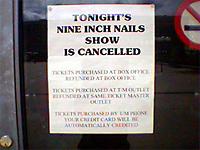 5月11日 晴天。悔しさ記念に昨日の貼り紙の写真を撮りに行く。その後早々にマンハッタンに帰る。みち母娘と別 れ、買い物に行く。アップタウンをぶらぶらするものの、買いたいと思う物はなく不発。友人に頼まれた物をさがすのみ。夜はブルックリンのみちママ友人宅のパーティに誘ってもらい、おいしいごはんをいただく。11時を過ぎていたが、地下鉄で帰っても安全と言われ、そうする。本当に治安は良くなってる。地下鉄も混んでいるし、駅からホテルへ向かう時も他の人も歩いてるから安心。9日に会った知人もMSGでのライブ終了後34丁目のMSGから、ミッドタウン48丁目の東にあるホテルまでなら歩いて帰っても大丈夫と言っていた。 『NIN以外のことも。まずAPC。正直に言うとやや期待はずれ。耳に馴染むと、胸に染み込んで来るものがあるのではと思っていたのですが、逆にだんだん単調に感じられます。ヘヴィーなサウンドだけど、うねりというか、奥行きが無い、何か平坦。 こちらのライヴもセキュリティは厳重です。ボディチェックは必ず受け、金属探知機を持った係員もいます。会場の中には警官も。ライヴ中に通 路に立ったりすると懐中電灯の光でさされ、すぐ移動させられます。フロアに仕切りはなし。ただPAの前に収まる人数しか入れてない。ステージ前のセキュリティはサーフィンして来る人を受け止めるというより、掴まえて引き摺り下ろしている。そのための踏み台が前の柵に着いている。予想以上に厳しいです。何故かNYのセキュリティが一番ゆるい』 5月12日 帰国 DL1969便 ニューヨーク(JFK)8:30 ― ポートランド11:15、20分の遅れで到着。2時間の乗り換え便待ち。6月10日ここでライヴがあるのよねーと考えながら待つ、というか1ヵ月後、私ここに立っててやるって思いながら待つ。 DL51便 ポートランド13:20 ― 成田15:30 予定通り到着。旅の終り。 『NINのライブの後は胸が一杯になってあまり食べられなくなる。家に帰って体重を計ったら3キロ減ってた。本当に楽しい旅でした。毎日毎日、来て良かったと思いながら過ごしました』 5月21日 禁断症状 今朝起きて、発作的にニューオリンズに行きたくなり、25日のチケットを取ろうとチケットマスターにアクセス。すでにインターナショナル・カスタマーは申し込めず、USカスタマ−のふりをしてシートをサーチすると、さすがにもう3階席しかなく諦めた。もし1階席が取れていたら何もかもブッちぎって行ってたかも。そしてNOTHING STUDIOを探し求めて街をうろついていたに違いない。 6月17日 ユタ州 ソルトレイクシティ E CENTER OF WEST VALLEY UA838便 成田17:05 ― サンフランシスコ9:55、予定より30分早く到着。入国審査後、乗り換え便のゲートに移動すると出発時間が1時間遅くなってる。4時間待ち。 DL1534便 サンフランシスコ14:00 ― ソルトレイクシティ16:40、タクシーでホテルへ。タクシーの中から会場が見えた。ホテルと会場があるエリア(ウエストヴァレーという町のはずれ)は、大きな敷地に劇場、映画館、アリーナがありその周辺にホテルとファーストフードのお店がそれぞれ数軒づつあるという造り。駐車場を突っ切ればホテル、これなら帰りも安心。でも一応下見。“reptile”をリハーサルしているのが聞こえて来た(本番では演奏しなかった)。 サンフランシスコでの入国審査で、観光と言いながら二泊しかしないということでいろいろ質問された。「ロックのコンサートを見るために来た」と答えると、「そのためだけに日本からアメリカまで来たのか!」と呆れられた。「何てグループ?」と聞かれたので「NIN」と答えると、その審査官は「前のツアーは見た」と言い、今度は「ライヴのチケットはいくら? どの曲が1番好き?」とかNINについて質問された。「You are big fan of nine inch nails!」と何度も言われた。前回の追っかけの時も、タクシーのドライバーなどに「何のためにこの町に来たの?」とよく聞かれ、答えるたびにNINの名前を出してきたけど、NINを知っていたのはこの審査官が初めて。