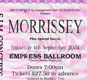 9月4日 Blackpool, England - Empress Ballroom わたしはパースで思いを遂げたので、あとはもう楽しむだけだから、ただただ存分に楽しみました。あと一回ある、って余裕も手伝って、とにかくただただいっしょに、これ以上でないって声でMORRISSEYと叫べたし、全て出せたと思います。ていうか、こんなスーパーハイテンションになれるときって日常あんまないからなー。 例のモリッシー・コールの後モリッシー登場、お股に花。 MCん時も歌ってる時もモリッシーの動きはかなり可笑しい、あ、いや、、ある意味かわいらしいとでも言っておきましょうか、なんですけど、それを文章にできないのが口惜しい。なので絵に書いてみました(本公演ではなくいろいろ混ざってますが……)。 モリッシーのヒヒヒヒ……ムフフフフフな謎の笑みと"How soon is now?"が始まりました。パースよりは押されるけど、エディンバラほどではない感じで、お、これはじっくり堪能できるか?と思いきや、"FIRST OF THE GANG TO DIE"でエラいことになってました。あと"Shakespeare's Sister"ね。"LET ME KISS YOU"もみんな歌い過ぎ、モリッシーが脱ぐと騒ぎ過ぎ。確かにうれしいけど。 モリッシーは投げたシャツに群がるファンに「それ、今日ブラックプールで買った」等と。で、"Subway Train"で鳥のような奇声を何発か発し、続く"Every day is like Sunday"は大合唱、ていうかみんな怒鳴っている状態か。 ある男の人が2階席の手すり(?)のところに立ちはじめたり、そして、我等が最前列、なんやら後ろにいた女性の手がわたしの手の上に、続いて彼女のもう一つの腕も入ってきたり、「わっ、割り込む気かーー?!」と……無理無理!! もうこれ以上人は入れないっ!! 助けてくれ、つぶされるーー!! わたしは目はモリッシーにうっとり、体は柵にしがみつき……と思うや否や、その人、いつの間にか気が付いたら、わたしの横でハンカチ片手に泣きながら必死に叫んでいるではないですか。お陰でどなたか弾き出されたらしい……。となりのお兄さんが居ない……。 しかし"NOW MY HEART IS FULL"でわたしは完全に昇天。この曲には相当な思い入れがあったので、かなり自分の世界に入り込み、この、普段はとても冷めていると言われるたわたしが、なんと、なんと、涙すら浮かべてしまいました……(ま、このレポートだけ読んでるとやたら熱い人かもしんないんだけど……)。 「ダロウ・スパイサー・ピンキー・キュービット……」 深く優しい声を聞いてると、なんだかすごい安心します。モリッシーがでかく見えたり(太めになったというわけではなく)、雑草みたいで素晴らしい(勿の論いい意味でですよ)。めちゃくちゃ踏まれても絶対にまたはえてくるし、たまに消えそうになりつつ、だけどむちゃくちゃ根が深い、そんで、その中に、とっても美しい花が咲くもんだから、わたしはモリッシーが好きになってしまうのです。 ほんま、あんた、レコード出せて良かったねぇ……しみじみ、"NOW MY HEART IS FULL"でそんなものが駆け巡り………。 隣のその割り込み人も同じく昇天していたらしく、昇天ついでに曲間で余韻に浸ってると向こうもそうらしくなんだか目が合ってしまい、彼女のうれしそうな顔を見たら、わたしはとっても幸せな気持ちになりました。 "November spawned a monster"の前、モリッシーは「何聞きたい?」 「え、ハンサムデビル?」 客「わーーわーーぎゃーぎゃーー」 モリ「おっしゃ、ハンサムデビル!!」 客「うぎゃーーーーーーーーーーーーーーっ」壮大な盛り上がり。 ちゃらららんっららーー 始まったのは"モンスターの生まれる11月"。 モリ「はーははっ!!!(嘲るような笑い。)」 ……やっぱし……。 "THERE IS A LIGHT THAT NEVER GOES OUT"で後ろにいた肩車してた女の子が何やら必死にアピールしていて、モリッシーは気が付きこっちにきて、その子は肩車から倒れ込んでモリッシーに触れました。 強く思えば通じるものなのよ。そうでないのが俗世間の常なれど、ここでは通用してしまうのよ。だってモリッシーだからさー!!(とかいいつつ、筆者はこの後2回もステージに登るのに失敗したのでした……強く願っていてもかなわないことはやはり、あり、運も無論必要である。と訂正させてもらいましょうか……)。 モリッシーは見事な脱ぎっぷりでシャツを会場に投げました。その前に脱いだシャツをいわゆる股間という場所に突っ込み拭き拭き……ポーーーーイ、でもそれに群がる人人人ーーーーー!! ……匂い嗅いだ人いるのかな。そりゃ嗅ぐよね、嗅がない方が変だよね。非常に爽快な気持ちで見終えた、いや、参加し終えた、という感じでした。