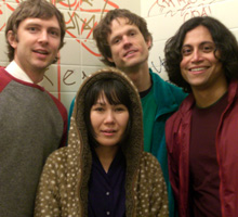 話はズレますけど、以前ビリー・コーガンにインタヴューした時にも「なぜ左利きなのに右利きで弾くんですか?」と訊いたことがあるんです。そしたら「クラシック・ギターはピッキングが主体だから、そっちを利き腕の右手でやる持ち方になったけど、ロックのギターはピッキングより運指のほうが重要だから、左利きでもこの形で弾くほうがいいと思って、こういう弾き方にしたんだ」と言ってました。 Ed:なるほどね。でも、俺たちの場合ふたりとも、変な弾き方をするから……。 John:そうそう、ふたりとも別々に同じこと思いついたんだよな。 Greg:だからこいつらには、ビリー・コーガンの理屈は当てはまらないんじゃないかな。こいつらのプレイはロックのスタイルってわけじゃないから。 Ed:あまりコードを掻き鳴らしたりしないからね(笑)。 なるほど。それでは、サトミさんのヴォーカル・スタイルって、それまでアメリカのどこを探してもなかったようなスタイルだったと思うんですが……日本の童謡とかに近いというか、『おかあさんといっしょ』的な……。 Satomi:あー、アハハハ(笑)。『ポンキッキ』とか? そういう感じのことをディアフーフでやってしまえ、と思ったのは? Satomi:別に“やってしまえ”と思って、やったわけじゃないんです。 ごく自然にそうなっていた? Satomi:やっぱり家にいて歌ってることが多いから、そこからパッと出てきたものをグレッグがいいと言ってくれて。別に奇をてらってとか『ポンキッキ』狙ってやってるわけじゃないんです。でもなんか、お子さんにもウケがいいから……結構ちっちゃいお客さんとかも来てくれるし。 『Pancake Mountain』にも自然な感じで出演されてましたもんね。 Satomi:自然に(笑)。(英語で)『Pancake Mountain』観てくれたんだって。 Greg:クール! Satomi:“子ども番組の歌のお姉さんみたいな歌い方なのはどうしてか”っていう質問なんだけど……意図的なのかどうかって。 Greg:ウホ(笑)。 Satomi:自然に口から出てくるまんま歌ったら、グレッグが気に入って「それでいこう」って言ったんだよね。 Greg:うん、僕は……僕はサトミのファンなんだ。サトミの歌がホント好きで……だから、ディアフーフがサトミの声を創ったというわけじゃないんだよね。すでに彼女は自分の声を持っていた。で、それがディアフーフというバンドに合ってた、と。確かに僕もときどき「キッズ・ミュージックっぽい声だな」って感じることはあるけど、でも他にも彷彿とさせるものはたくさんあると思うよ。たとえば60年代の終わり頃って、もともとシンガーじゃなかった女性シンガーが結構いたじゃない? ニコとかブリジット・バルドーとか“歌は第2の趣味”みたいな感じでさ(笑)。ふたりともどこか冷めた、すごくシンプルな歌い方をするんだけど――特にニコはそうだったよね――それが、どことなくサトミの歌に似てると思う。あと、ボサノバのヴィブラートを入れないスタイルだったりとか、それから“アーリー・ミュージック(古楽)”を彷彿とさせる部分もあると思うな。つまり、すごく昔のヨーロッパのクラシックの歌唱法っていうか――ボーイ・ソプラノとか、そういうのだよ。飾り気のない、分かりやすい歌い方で、音が絶対滑らないしヴィブラートもまったくかけてなくて……僕はああいうのを聴くとJ-POPを思い出すんだよね。J-POPってある意味で子どもの音楽だけど、子どもだけが好きってわけじゃない。とにかくサトミの声って飾り気がなくてあっさりしてるんだけど、逆にそうだからこそ、ものすごく幅広いスタイルに対応できるんだと思う。しかも仕上がりは、モノクロームのスケッチのようなんだ。完全な模倣になることが一切なくて、彼女の手にかかるとどんな歌もその白黒ヴァージョンになる。ミニマルなスケッチみたいになるんだよ。 John:書道か何かみたいにね。 Greg:そうそう。 Ed:特に今回のアルバムは、君のヴォーカルのエレガントさが出てると思うよ。一瞬で美を生み出す力が、今回は特にすごく出てる。 ステージでのアクションとかも、自然に出てきたものなんですか? Satomi:あれも自然ですね。“自然”って言うか、何だろ……でも、みんな頑張ってるから――ジョンとか白目むいてやってるし……。 Greg:キャハハハハ! Satomi:だから“自分も何かしなきゃな”みたいな感じで。でも昔、ロブっていう人がいたときはもっとすごくて、ギターとかでアタックしてきて、押しくらまんじゅうとかしたりとかして、何かそんなことしてるうちに動くようになったんですけど、みんな動いてた方がやっぱり楽しいし、お客さんも見るところが拡散した方が、音楽を聴いてるだけじゃなく、何かこう錯覚を覚えません? “ここのサウンドはああいうふうじゃないのに、なんであんなに動いてるんだろう?”とか。だから、ちょっと演劇的なところっていうのはすごいあると思います。デヴィッド・ボウイとかも好きだし、“見せたいな”っていうのはあるんで……コス